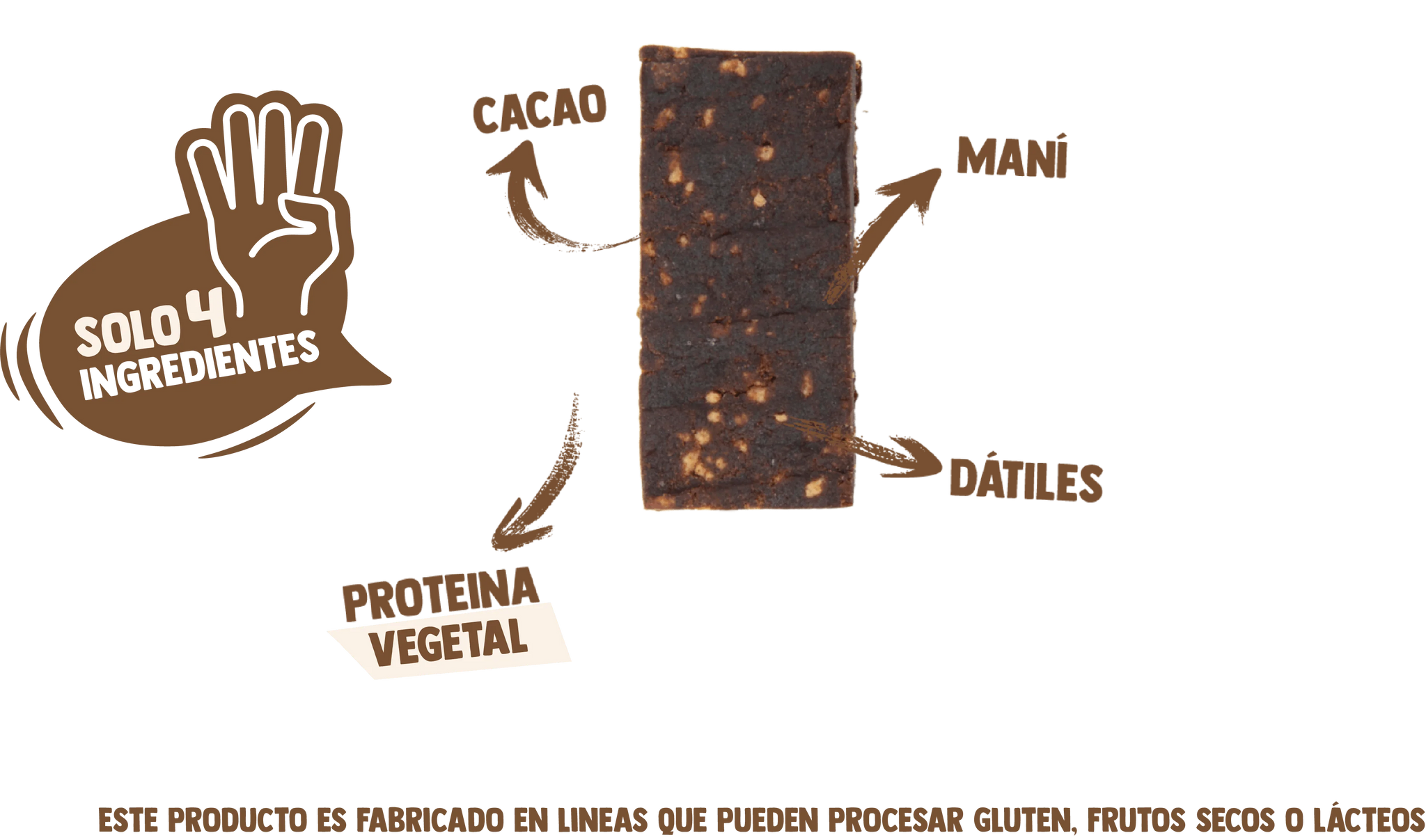 Con solo 4 ingredientes reales — Dátil, Maní, Proteína de Soya, Caca — ofrece 10g de proteína 100% vegetal por porción, ideal para un snack nutritivo, funcional y sin complicaciones.