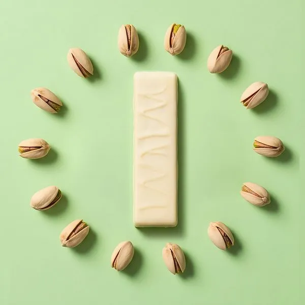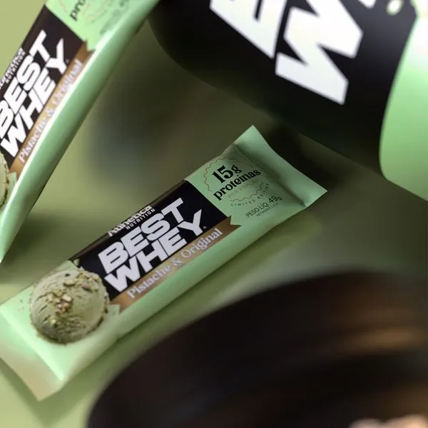 Una barra con sabor pistacho, cremosa y con un toque dulce sin azúcar. Aporta una textura suave con un baño tipo chocolate blanco y un relleno con notas auténticas de pistacho. Entrega 15 g de proteína por porción, ideal para recuperar y saciar entre comidas.