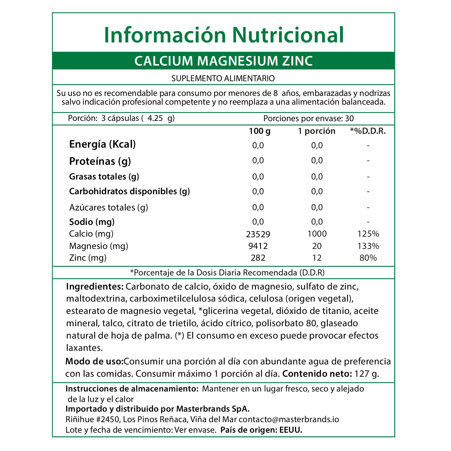 Carbonato de calcio, óxido de magnesio, sulfato de zinc, maltodextrina, carboximetilcelulosa sódica, celulosa (origen vegetal), estearato de magnesio vegetal, *glicerina vegetal, dióxido de titanio, aceite mineral, talco, citrato de trietilo, ácido cítrico, polisorbato 80, glaseado natural de hoja de palma. (*) El consumo en exceso puede provocar efectos laxantes.