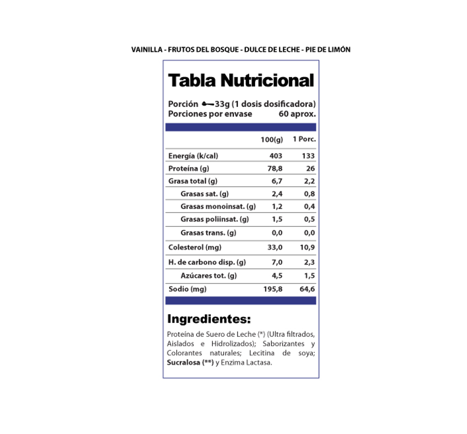 Proteína de Suero de Leche () (Ultra filtrados, Aislados e Hidrolizados); Saborizantes y Colorantes naturales; Lecitina de soya; Sucralosa (*) y Enzima Lactasa.